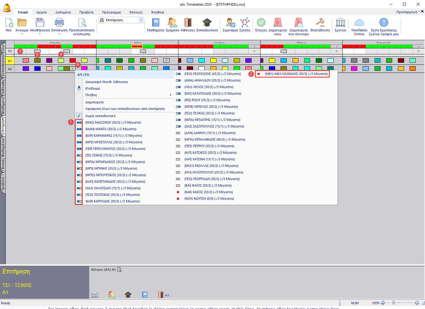 Το μενού που θα εμφανιστεί θα περιλαμβάνει όλους τους εκπαιδευτικούς που είναι διαθέσιμοι εκείνη την ώρα. Οι εκπαιδευτικοί κατατάσσονται, έτσι ώστε οι καλύτεροι εκπαιδευτικοί για να καλύψουν την επιτήρηση είναι πρώτοι. Τα χρωματιστά τετράγωνα σας δίνουν πληροφορίες σχετικά με τις διδασκαλίες των εκπαιδευτικών πριν και μετά την επιτήρηση. Τα πράσινα τετράγωνα σημαίνουν ότι ο εκπαιδευτικός διδάσκει κοντά στον χώρο της επιτήρησης. το μπλε ότι διδάσκει σε κάπου αλλού. Το κόκκινο τετράγωνο σημαίνει ότι ο εκπαιδευτικός έχει ήδη επιτήρηση κάπου αλλού. Οι αριθμοί μετά τα ονόματα των εκπαιδευτικών δείχνουν πόσες επιτηρήσεις έχει ήδη ο κάθε εκπαιδευτικός. (λεπτά/σύνολο).