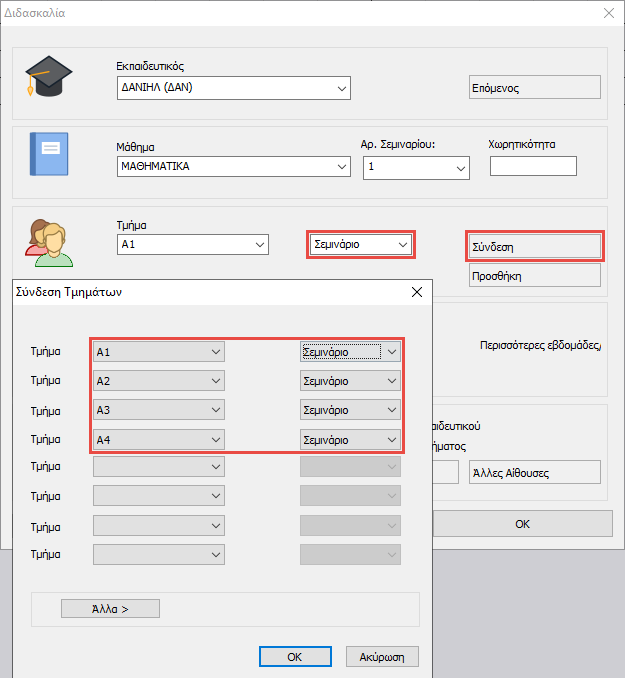 Η καταχώρηση των διδασκαλιών για τα σεμινάρια γίνεται πολύ εύκολα. Ουσιαστικά μπορείτε να τις καταχωρήσετε ακριβώς όπως οι κανονικές διδασκαλίες (διδασκαλίες που αφορούν όλο το τμήμα), με την μόνη διαφορά ότι στο πεδίο "Ομάδα" θα πρέπει να επιλέξετε «Σεμινάριο». Οι διδασκαλίες σεμιναρίων που γίνονται σε περισσότερα τμήματα εισάγονται με τον ίδιο τρόπο όπως οι συνηθισμένες διδασκαλίες στις οποίες χρησιμοποιούμε την «Σύνδεση» τμημάτων, μόνο που σε αυτή την περίπτωση θα πρέπει να επιλέξετε το «Σεμινάριο» ως ομάδα για όλα τα τμήματα: