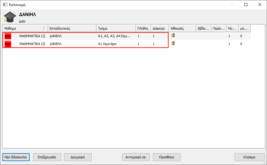 Μια ειδική περίπτωση είναι όταν υπάρχουν δύο διδασκαλίες σεμιναρίου για το ίδιο μάθημα σε ένα τμήμα. Η εφαρμογή καταλαβαίνει αυτές τις δύο διδασκαλίες σαν ίσες. Αν π.χ. υπάρχει μαθητής που παρακολουθεί το μάθημα αυτό, δεν έχει σημασία σε ποια από τις δύο διδασκαλίες θα ανήκει (αλλά μπορεί να ανήκει σε μόνο μία). Αυτό χρησιμοποιείται συνήθως όταν πολλοί μαθητές θέλουν να παρακολουθήσουν ένα μάθημα, γι 'αυτό και πρέπει να χωριστούν σε ομάδες.