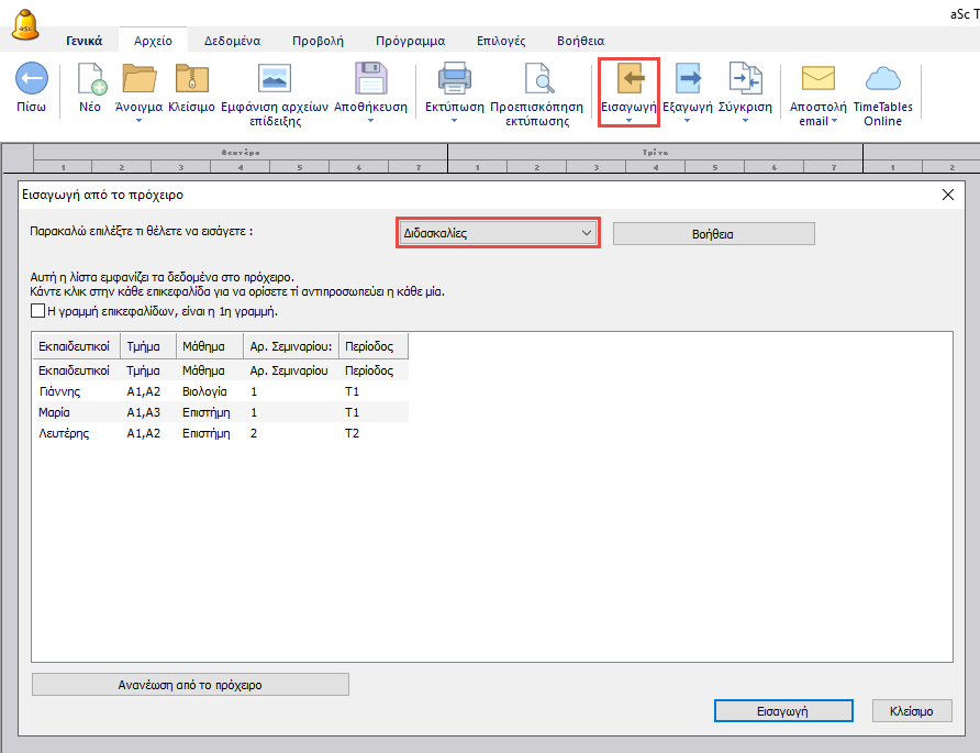 2. Ανοίξτε το ADVANCED TIMETABLES και δημιουργήστε ένα καινούργιο ωρολόγιο. Μετά κατευθυνθείτε στο μενού Αρχείο/Εισαγωγή/Εισαγωγή από πρόχειρο.