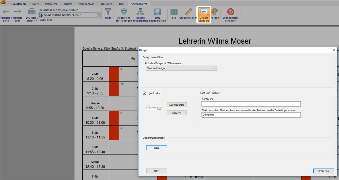Alternativ können Sie die Verwendung von Druckausgabedesigns wählen. Dies ermöglicht Ihnen das Layout Ihres Stundenplanes nach einer Vorlage mit einem Klick zu ändern.