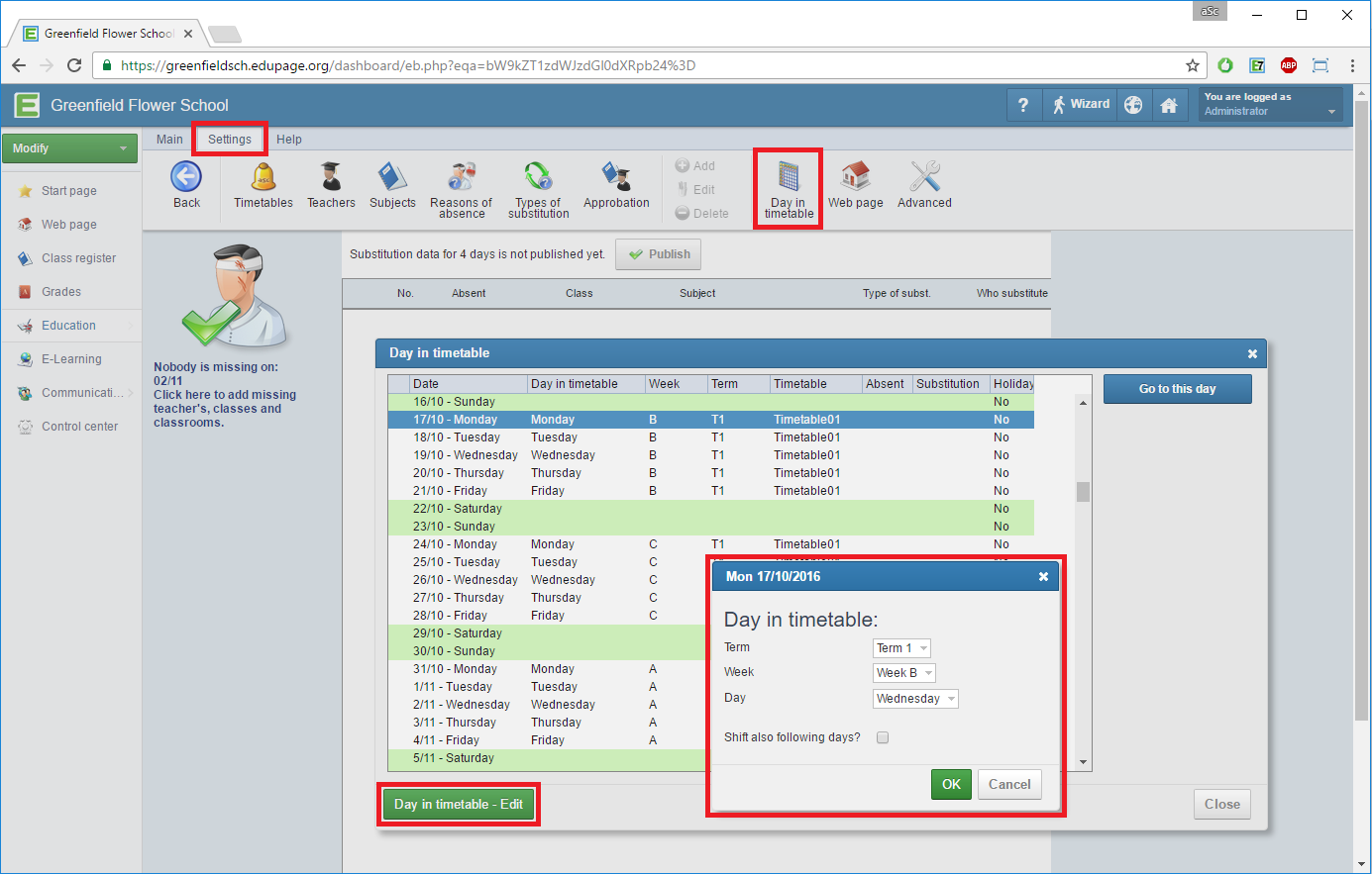 For each day in the substitution software you can manually change the day (week/term). This timetable day is then used to determine what has to be substituted.