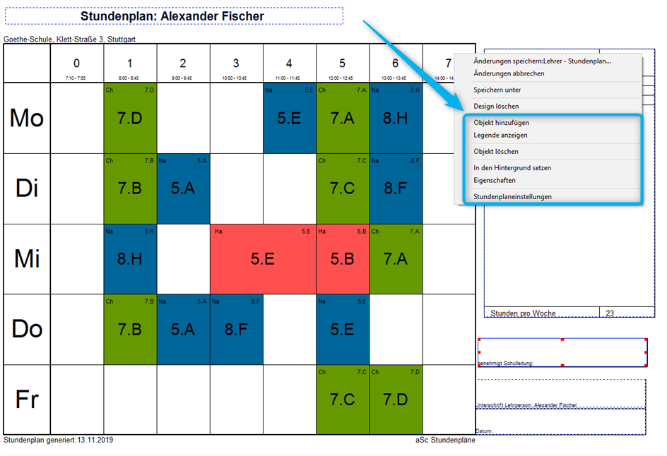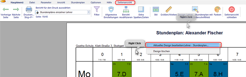 Nach Fertigstellung der Druckvorlage für Ihren fertigen aSc Stundenplan können Sie mit Rechtskick auf den Plan immer das Layout und Design in der Seitenansicht Ihres Stundenplans anpassen.