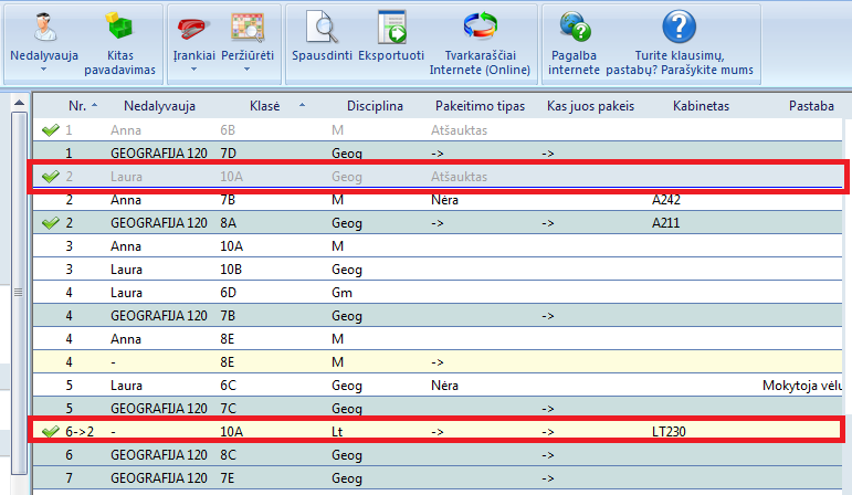Atsivers toks langas. Programa pasiūlys atšaukti 2-rą pamoką ir perkelti 6-tą pamoką į jos vietą.