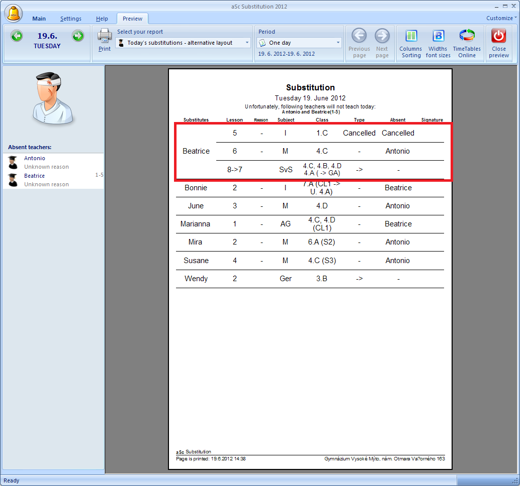 Here the first column is teacher that needs to be notified. So for example the picture bellow tells the teacher Beatrice that