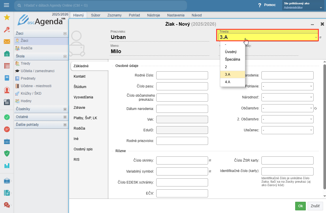 1. Novú triedu vytvoríte v Agende online/Triedy.