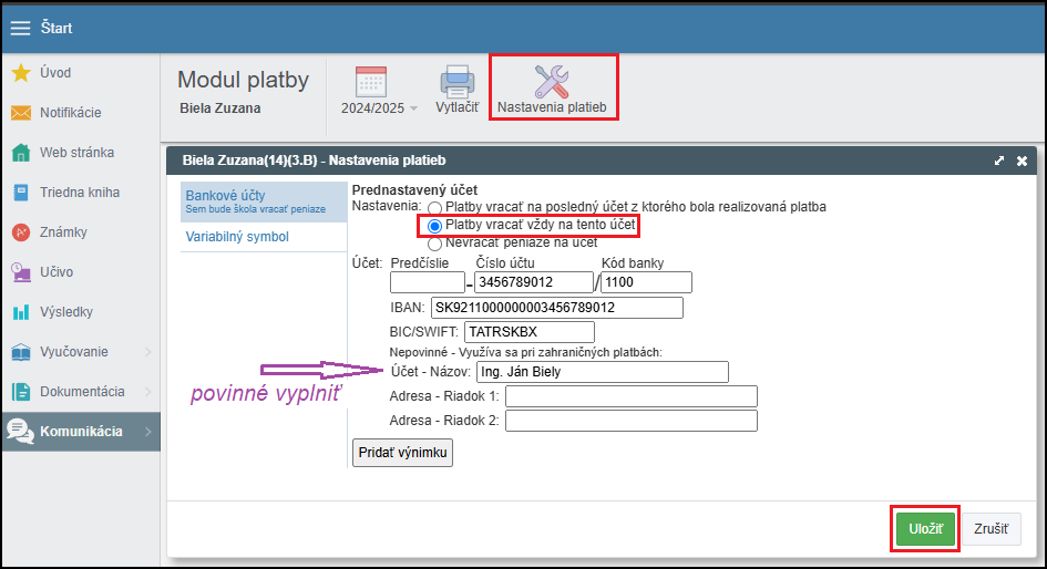 V module Platby môže rodič vo svojom rodičovskom konte na webe nastaviť číslo svojho bankového účtu, na ktorý chce, aby mu škola vrátila prípadné preplatky.