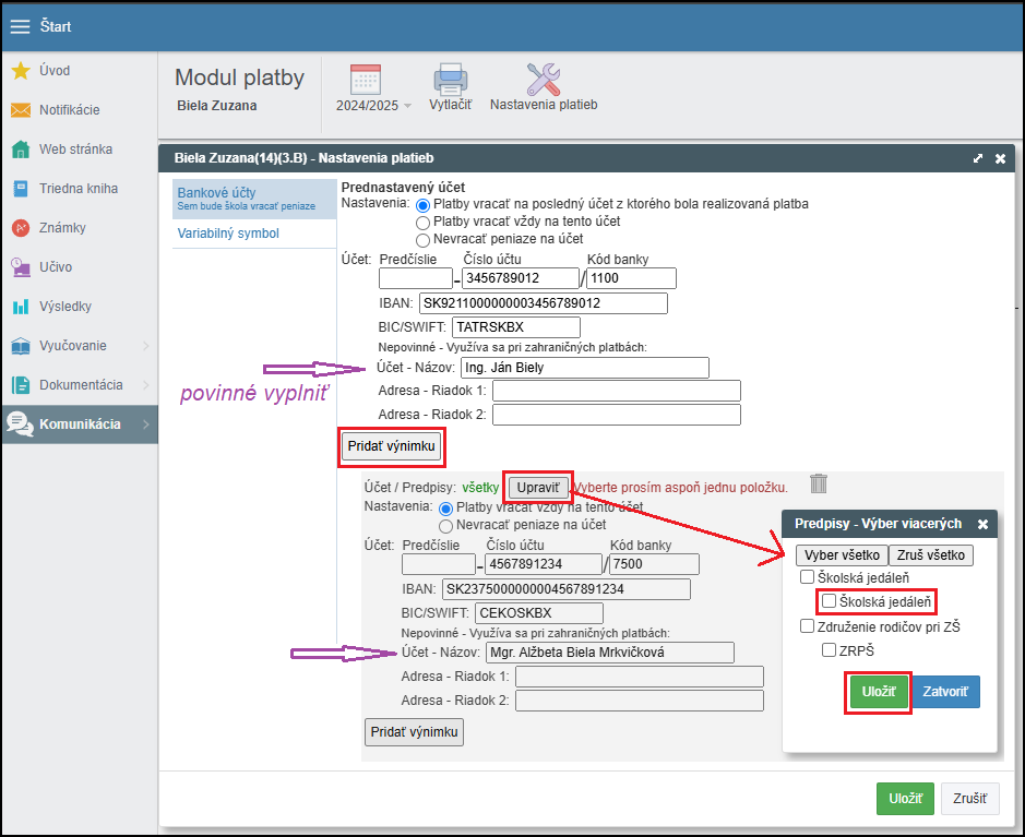 V prípade, že rodič chce vrátiť preplatok z rôznych predpisov na iné bankové účty tak si môže Pridať výnimku, kde je potrebné vybrať si konkrétny predpis, zadať bankový učet a nastavenie Uložiť.