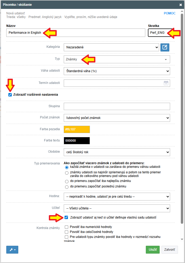 Každý učiteľ, ktorý má hodiny tohto predmetu (v našom príklade Anglický jazyk), potom po prihlásení bude mať v známkach už zadanú udalosť, ktorú ste prednastavili a bude môcť rovno do nej zadávať známky.