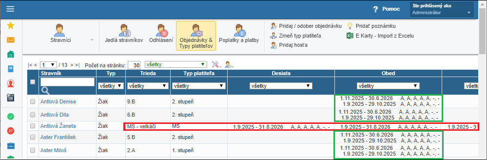 V prehľade prednastavených objednávok potom budú mať žiaci ZŠ obdobie objednávok rozdelené (je vynechaný týždeň 27.2. - 3.3.2023) a škôlkari majú prednastavené objednávky stále pre súvislé obdobie.