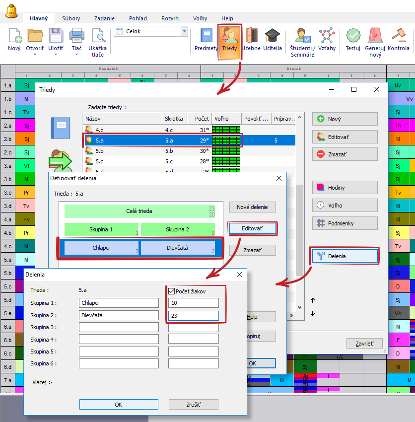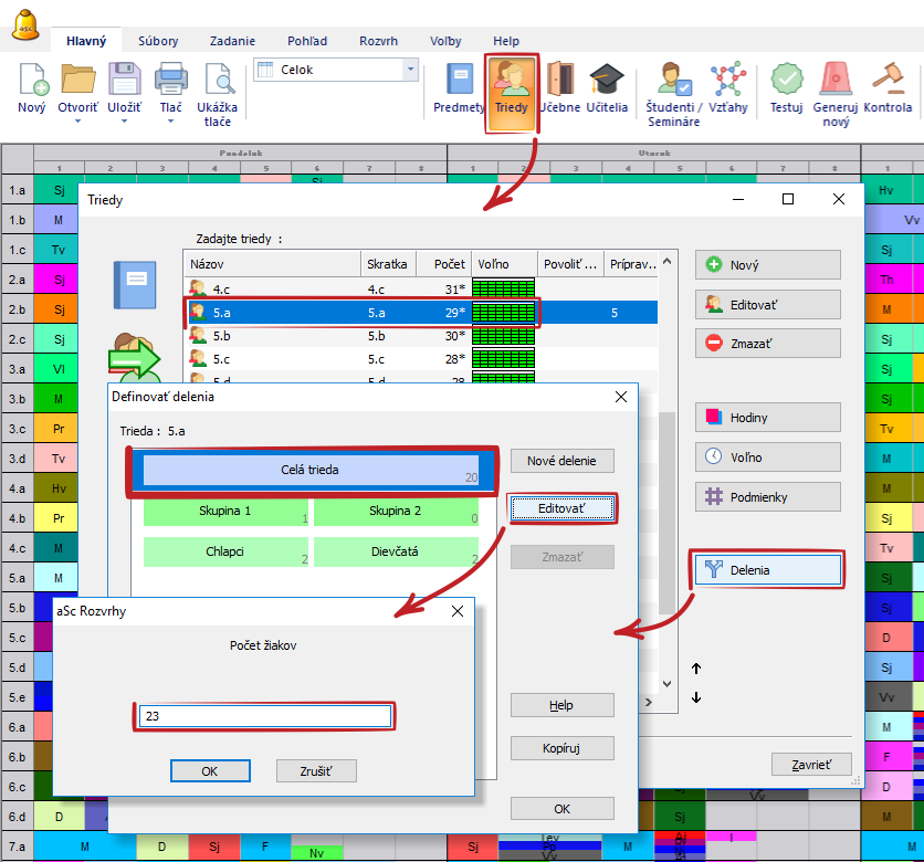 Pre každú triedu môžete v "Deleniach" zadať celkový počet žiakov