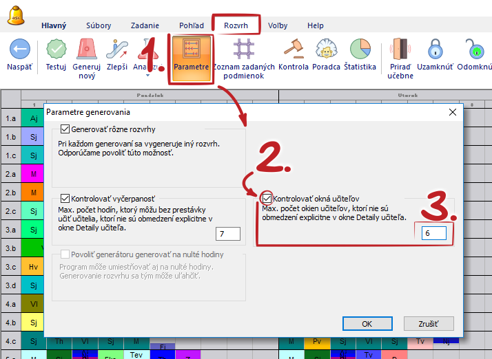 1. Najprv v menu Rozvrh - Parametre - Kontrolovať okná učiteľov nastavte celkový počet povolených okien (dier) v rozvrhu učiteľa za jeden týždeň. Táto hodnota bude potom prednastavenou pre všetkých učiteľov.