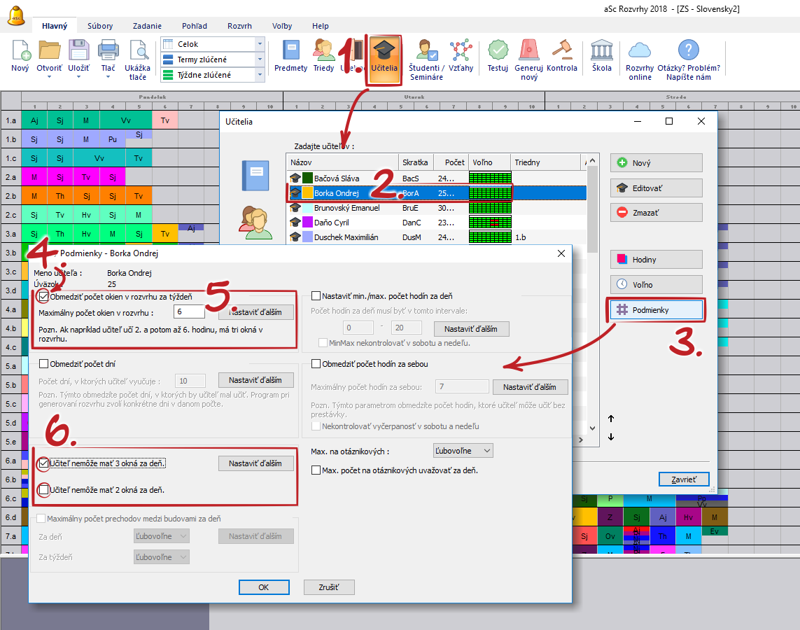 2. Počet povolených okien v rozvrhu môžete potom nastaviť učiteľom aj jednotlivo. V menu Hlavný - Učitelia - zvoľte učiteľa a kliknite na Podmienky - Obmedziť počet okien v rozvrhu za týždeň prispôsobíte hodnotu, ktorú ste nastavili globálnym parametrom.