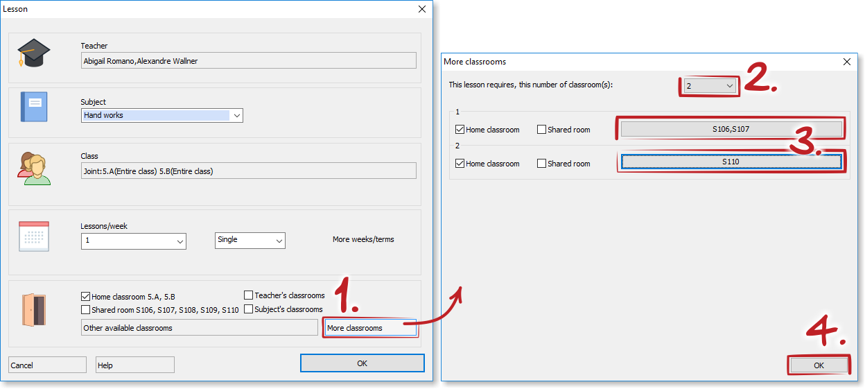Example 1: I have "Hand work" lesson, where are joined 2 classes with 2 teachers, but I need them to be allocated into two classrooms.