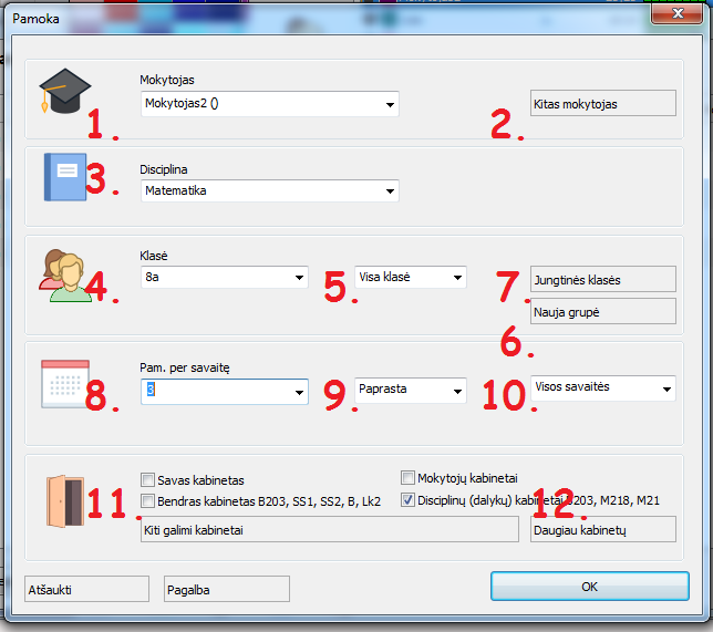 12.Daugiau kabinetų: Jei pamokai reikia daugiau kabinetų (t.y. vienu metu dviejų, trijų), pasirinkite juos.