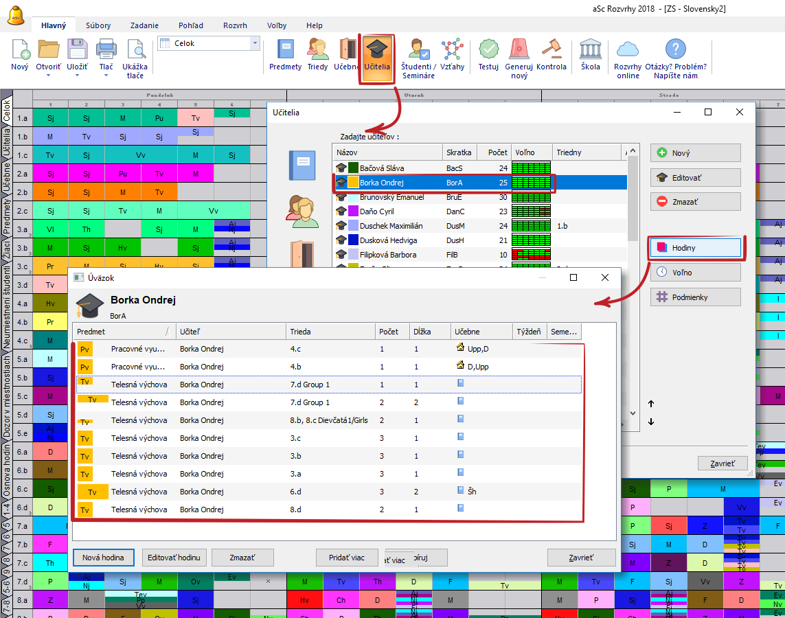 Každý riadok predstavuje jednu hodinu. Zobrazené údaje: predmet, trieda(alebo triedy v prípade, že učiteľ učí spojené triedy), dĺžka hodiny, počet za týždeň, skupiny v určitej triede, učebňa, cyklus a viac učiteľov.