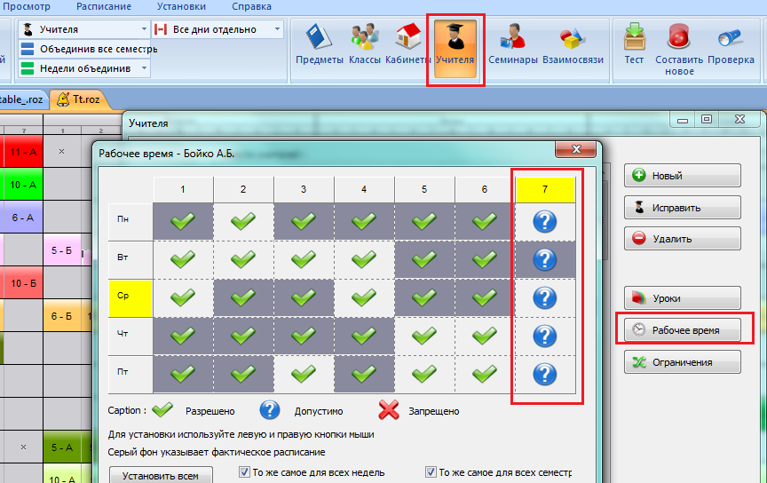 Вы можете определить, сколько уроков может быть помещено в позициях, помеченных вопросительным знаком. Например, если отмечены 6-ые урока и число - 2, тогда учитель будет иметь только два 6-ых урока в неделю.