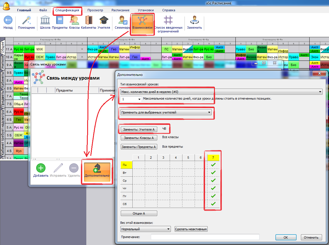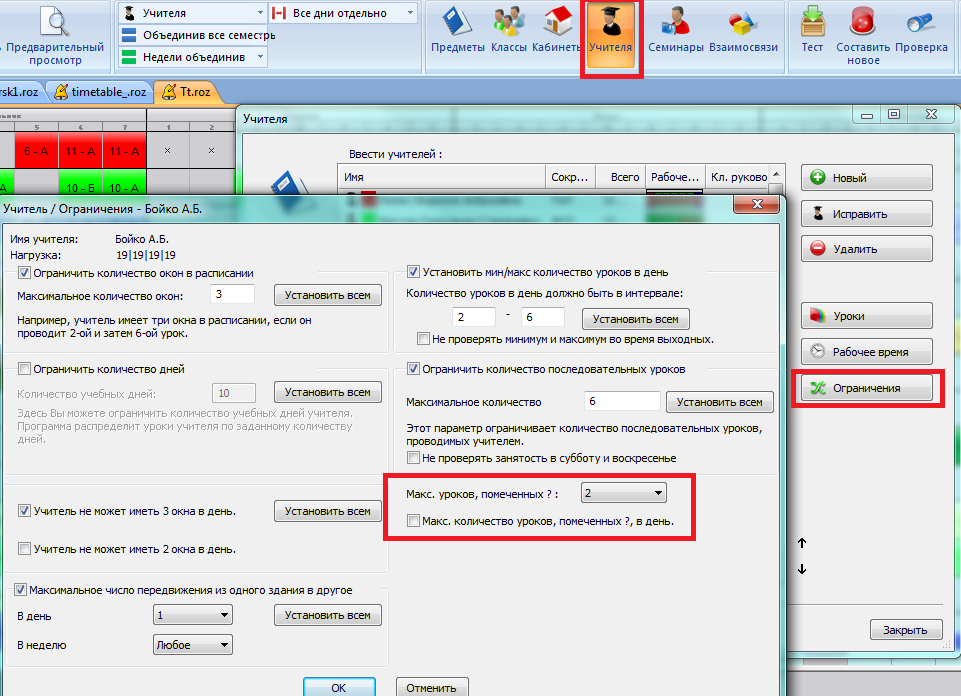 Используя опцию ниже, Вы можете алгоритму задать, чтобы это число трактовалось как "в день", а не в неделю. Например, Вы можете задать, что вопр. знаком отмеченные 5-ые, 6-ые и 7-ые уроки, и учитель может иметь максимум два в каждый день в течений времени 5-7 уроков. Так Вы можете быть уверенным, что учитель имеет по крайней мере один свободный урок для обеда.