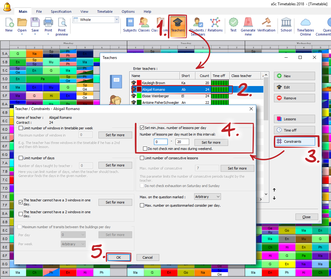 - puede especificar que estos valores no se controlen el sábado/domingo. Así que el profesor tendrá 2 lecciones cada día de lunes a viernes, sin embargo puede tener 0 o 1 el sábado.