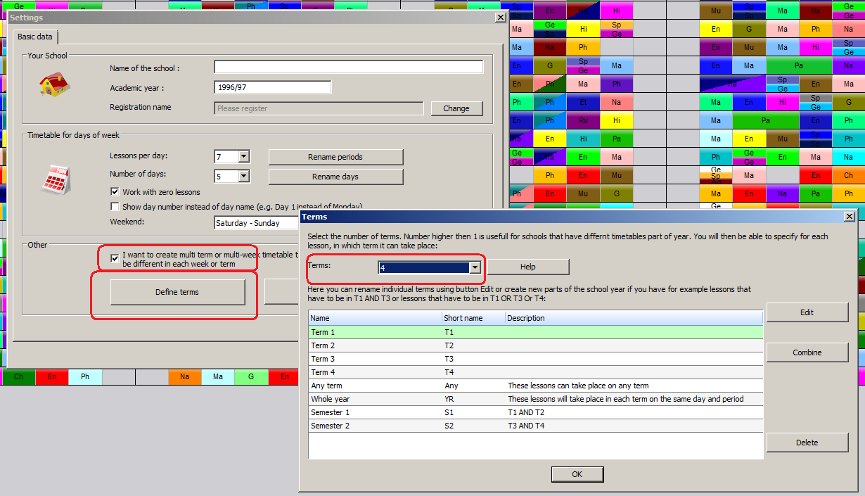 Podobne ako pre dni aj pre termy možete vytvoriť špeciálne termy. Ak používate 4 štvrťroky, program automaticky vytvorí 2 špeciálne termy nazvané Semester 1 and Semester 2. Semester 1 v skutočnosti je "T1 A T2". Čiže ak zadáte hodinu pre S1 bude sa nachádzať v T1 aj T2 v rovnakom dni a na rovnakej hodine.