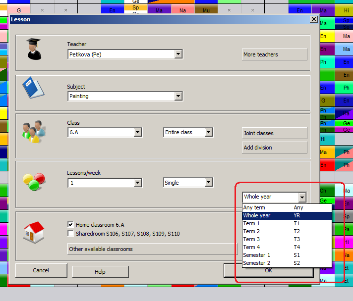 Pre každú hodinu môžete definovať, v ktorom semestry alebo štvrťroku (terme) má byť umiestnená. Môžete priradiť presný štvrťrok prípadne zadať, že hodina má byť v ľubovolnom alebo v každom štvrťroku. Okrem toho môžete povedať, že hodiny maju byť v "T1 A T2" alebo "T1 ALEBO T2" alebo napríklad iba T4.