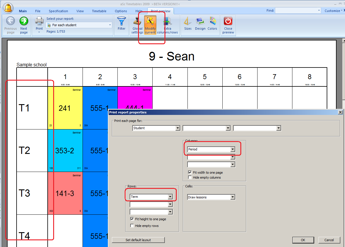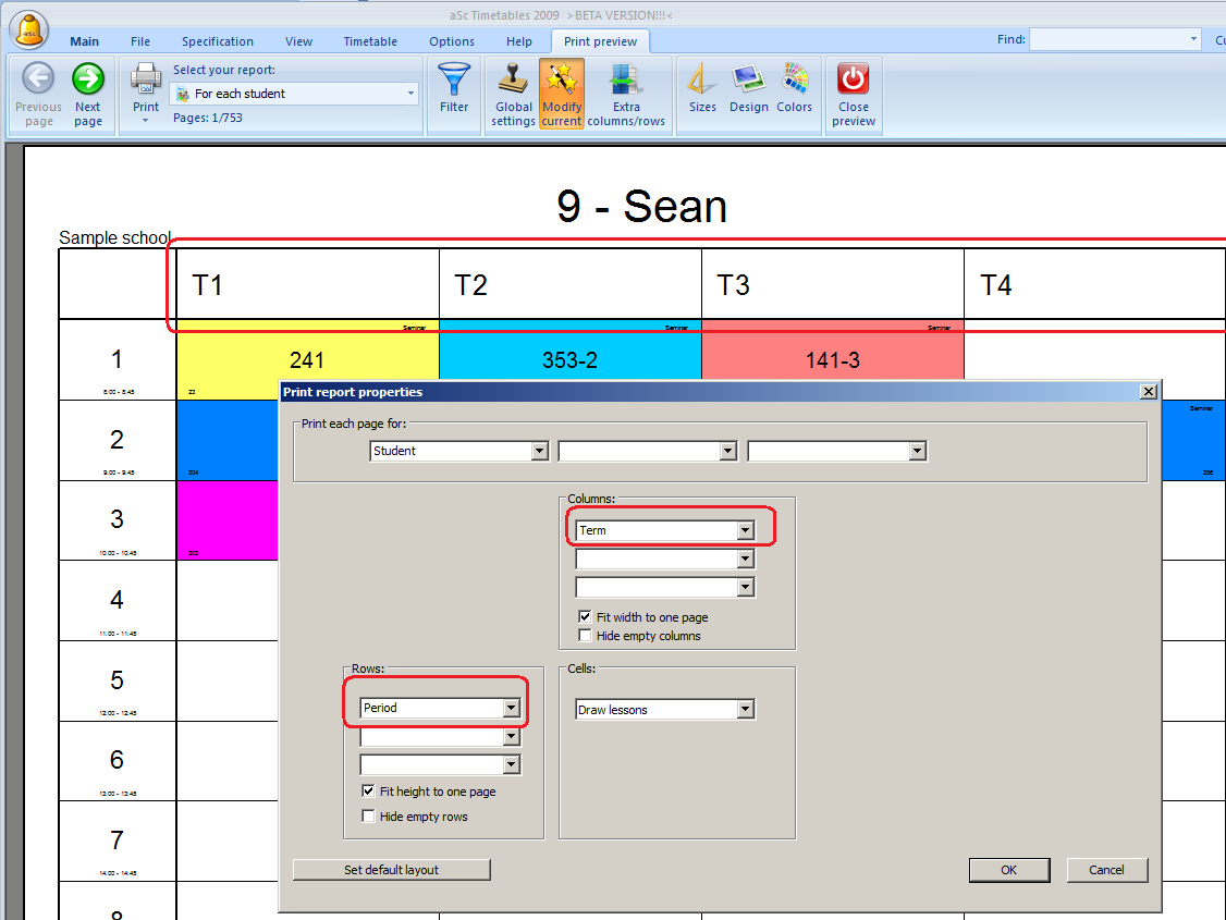 If you for example have different timetable each day and each semester, you can print a separate paper for each student and each term. Simply specify at the top part what shall be on each page. By default there is one page per student, you can add term in there: