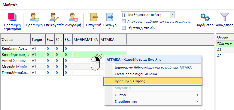 Κρατώντας πατημένο το πλήκτρο CTRL στο πληκτρολόγιο σας μπορείτε επιλέξετε περισσότερες σειρές (μαθητές) και στη συνέχεια κάνοντας δεξί κλικ στο κελί του μαθήματος, να αναθέσετε το μάθημα αυτό στους επιλεγμένους μαθητές.