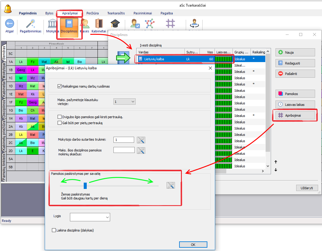Disciplinų apribojimų lange yra slankiklis. Kuo labiau jis paslinktas į dešinę, tuo tolygiau ši disciplina bus paskirstyta per savaitę.