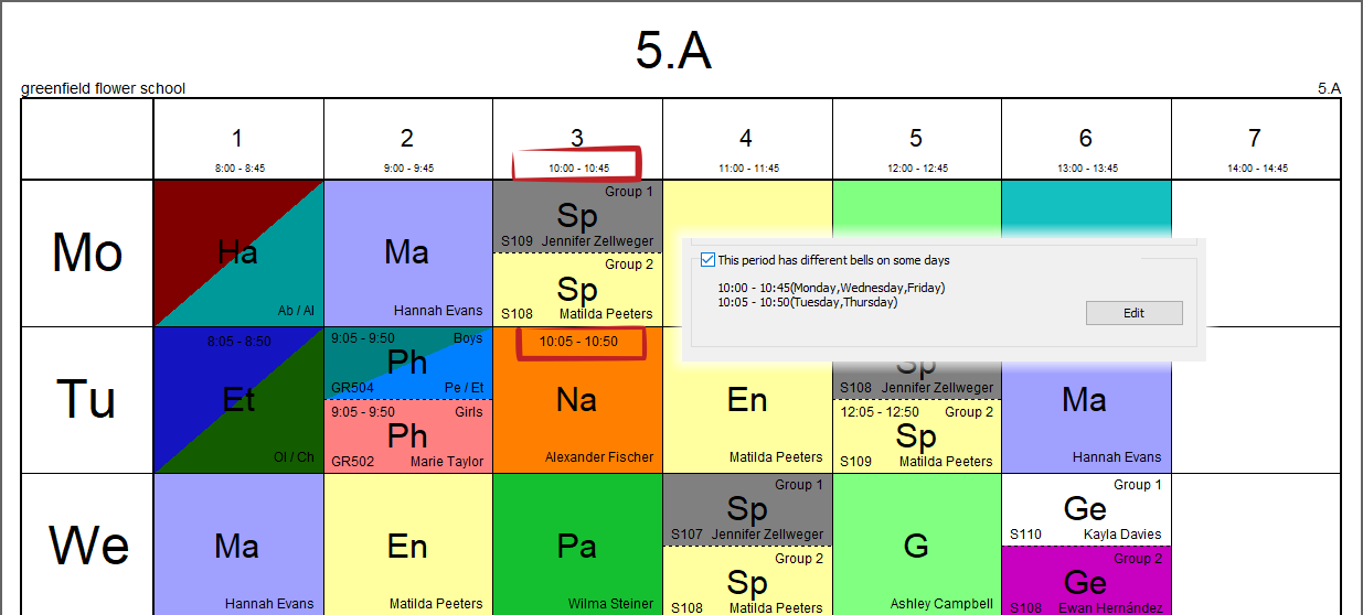 Това може да се случи в разписанието за класовете, когато има различни звънци в някои дни; в разписанието на учителите това може да се случи, когато учител преподава в част от училището с различно време за звънците.