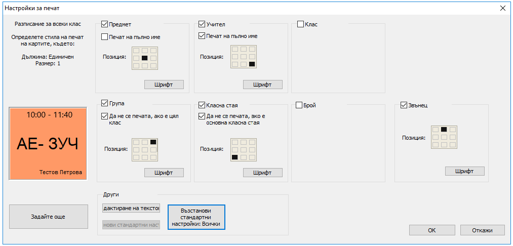 По подразбиране софуерът принтира времето за звънците под номера на съответния учебен час.