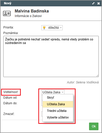 - vybraným učiteľom - napr. chcete, aby informáciu videl len školský psychológ, či špeciálny pedagóg