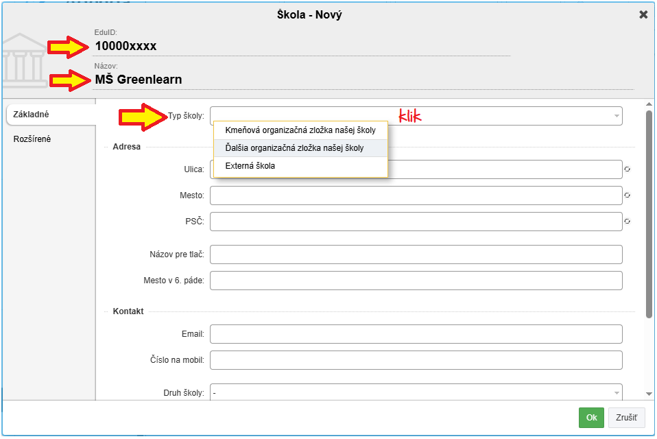 Vyplňte EduID(*), názov organizačnej zložky, typ školy a ostatné potrebné údaje.