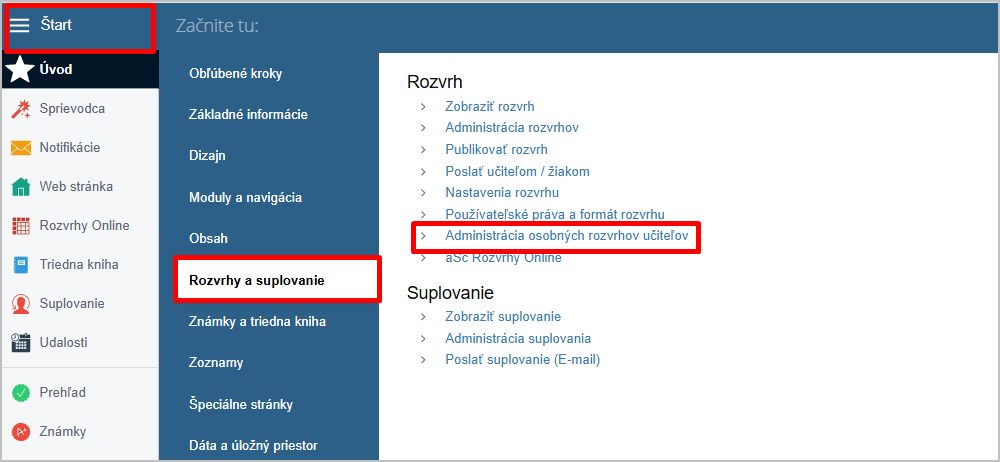 Cez štart zvoľte Rozvrhy a suplovania a potom Administrácia osobných rozvrhov učiteľov.