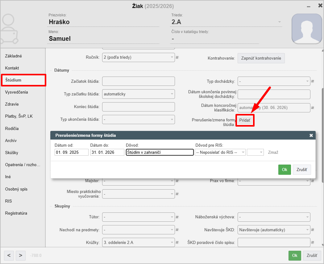 Ak máte žiaka, ktorý sa napr. odsťahoval do zahraničia a prerušil štúdium a nechcete, aby sa zobrazoval v dochádzke v elektronickej triednej knihe, tak mu zadajte prerušenie štúdia.