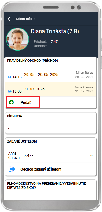 Učiteľ - Kde vidím a ako zadám žiakovi pravidelný odchod z ŠKD v mobilnej aplikácii