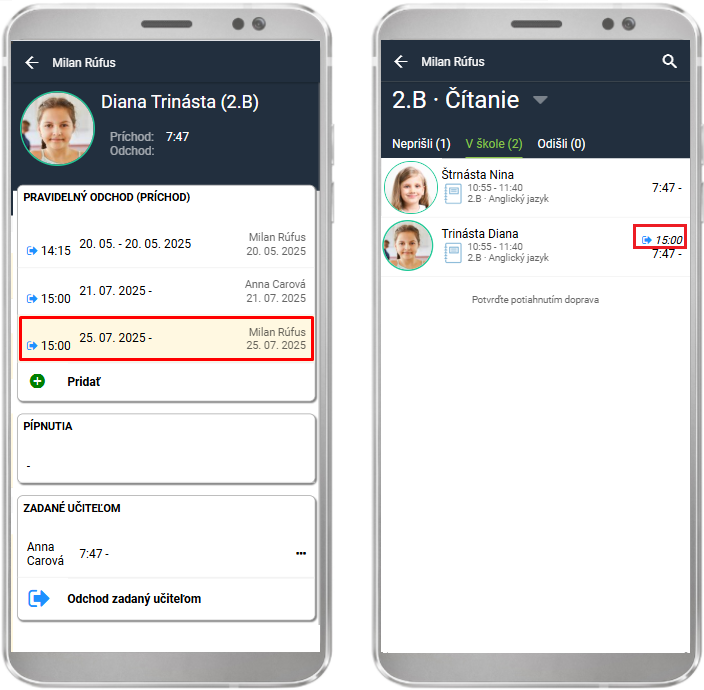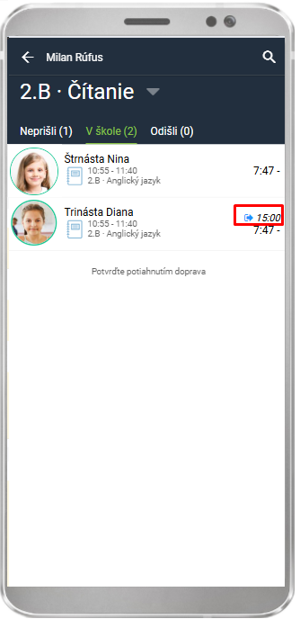 Učiteľ vidí v mobilnej aplikácii v module "Príchody/odchody študenta" pri mene žiaka aj zadané pravidelné odchody, ktoré zadal rodič, prípadne iný učiteľ: