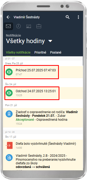 V prípade, že učiteľ zadá žiakovi príchod do rannej družiny/do MŠ cez modul "Príchody/odchody študenta" príde rodičovi o tomto notifikácia do mobilnej aplikácie, rovnako aj o takto zadanom odchode z ŠKD/MŠ: