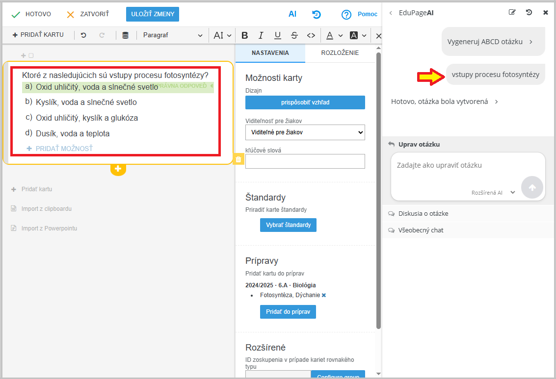 Vytváranie ABCD otázky v teste pomocou EduPage AI