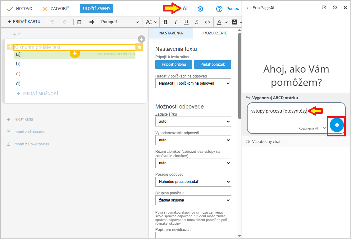 V hornom páse kliknite na AI. Vpravo sa otvorí panel s EduPageAI, je pripravená vygenerovať otázku aj odpovede.