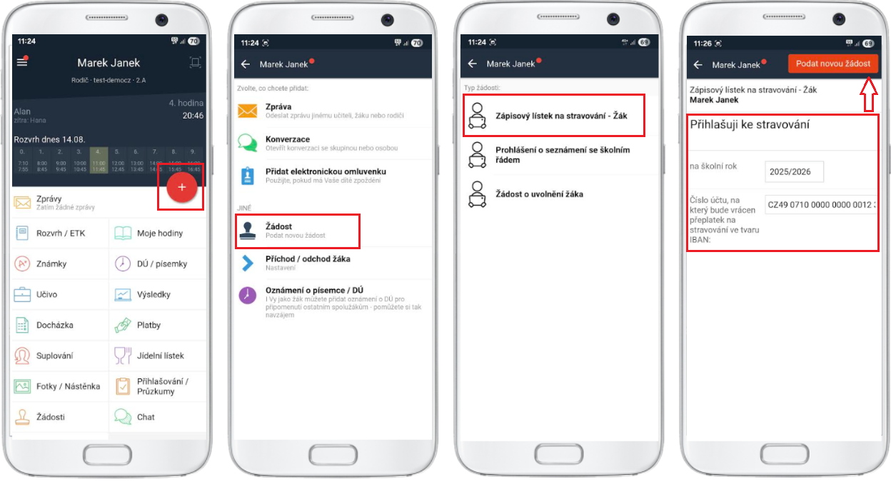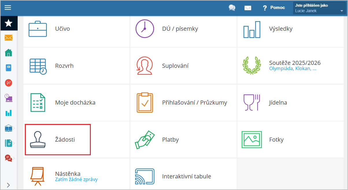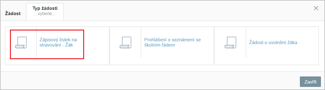 Kliknite na 'Žádost' a vyberte Zápisový lístek na stravování - ŽÁK.