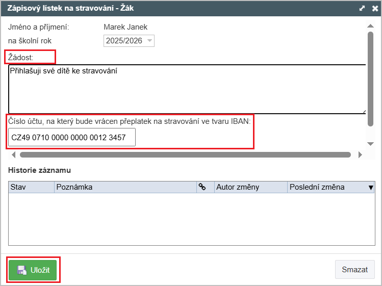 Vyplňte text žiadosti a uveďte číslo účtu. Stlačením tlačidla 'Uložiť' potvrdíte a odošlete žiadosť.