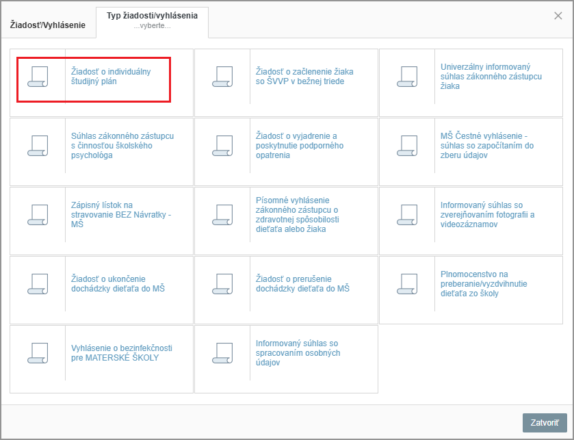 Zo zoznamu dostupných žiadostí a vyhlásení vyberte Žiadosť o individuálny študijný plán.