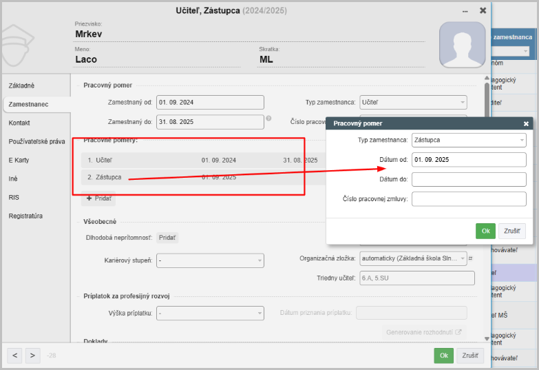 V časti RIS sa automaticky vytvorí karta a špecifické údaje, najmä pre odosielanie údajov o zamestnancoch do Centrálneho registra, si doplníme tam. - Viac pracovných pomerov zamestnanca (RIS)