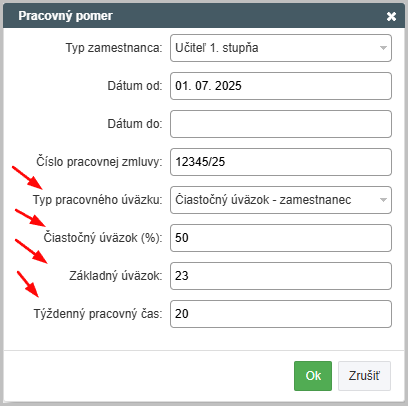 Pracovný pomer zamestnanca, je už možné aj bližšie špecifikovať, či už podľa typu úväzku - čiastočný, dohoda, externista. Takisto nastavenie % úväzku, aký je základný úväzok a týždenný pracovný čas daného zamestnanca na danom úväzku.