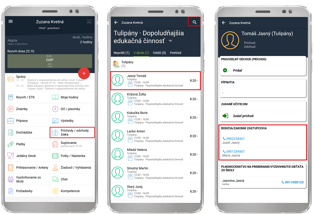 Vo vyhľadávači zadajte meno dieťaťa, o ktorom potrebujete informácie. Po kliknutí na dieťa uvidíte potrebné údaje, medzi ktorými sa nachádza aj telefónne číslo na rodičov/zákonných zástupcov.