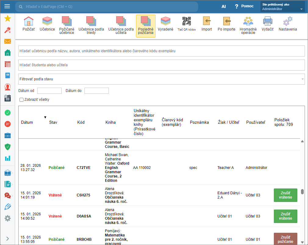 Viete prehliadať výpožičky podľa učiteľov, viete hromadne vrátiť učebnice požičané učiteľom; máte možnosť zoskupovať učebnice aj podľa titulov.