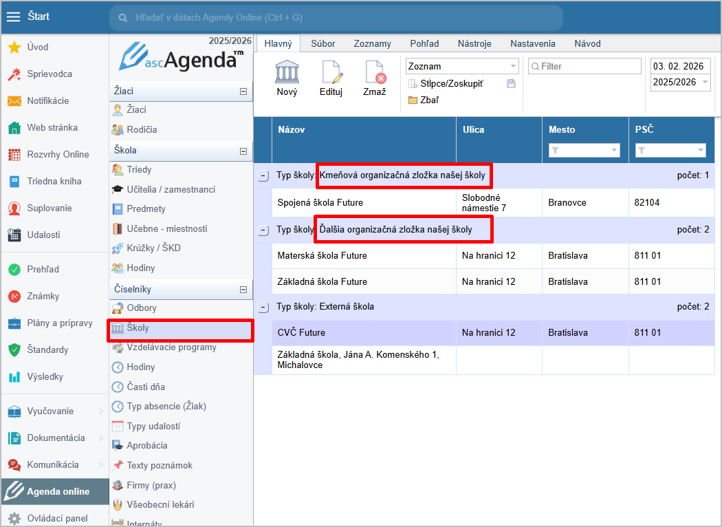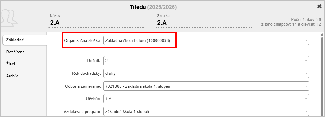 potom je potrebné každej triede nastaviť, pod ktorú organizačnú zložku patrí.