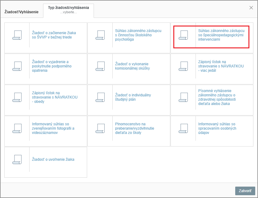Zvoľte Súhlas zákonného zástupcu so špeciálnopedagogickými intervenciami.