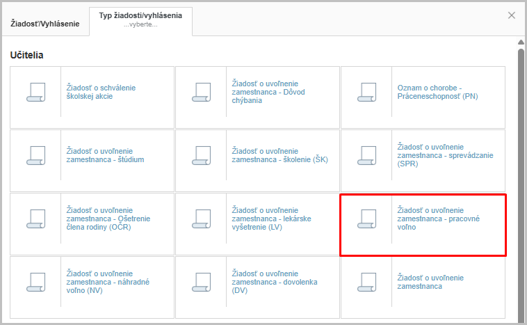 Ak ako škola používame žiadosti, tak si zamestnaci vyberú priamo Žiadosť o pracovné voľno, ktorá je rovno naviazaná na Dochádzku zamestnanca a už vyššie spomínaný druh neprítomnosti.