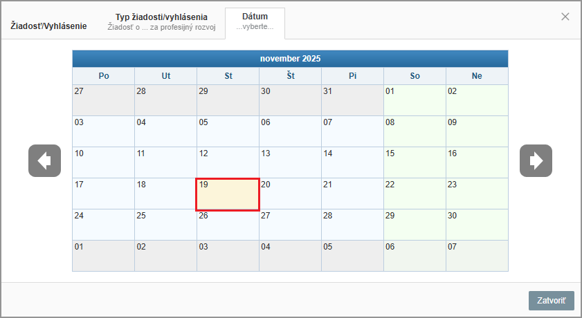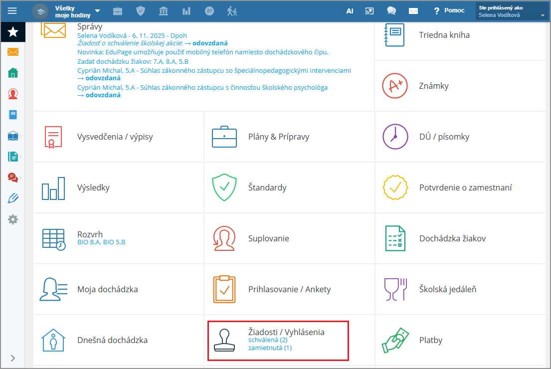 Prihláste sa do svojho učiteľského konta a v module 'Žiadosti / Vyhlásenia' pomocou červeného '+' vyberte konkrétny typ žiadosti: